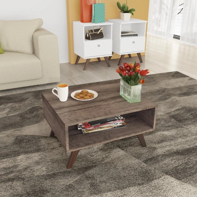 Mesa de centro retro fabricada en MDP de 15 mm y patas de plástico retro.